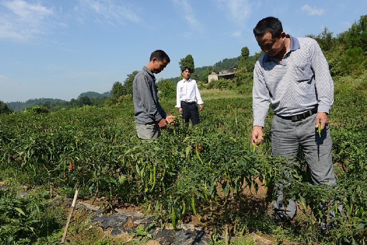 图为群众工作站工作人员正在帮助村民检查辣椒病虫害 余光龙 摄