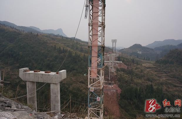 1月2日,石永二级公路司城河上游的控制性工程——钓鱼台大桥工地上施工人员正在加紧施工。钓鱼台大桥长299米,宽9米,桥面距河底高度86米,预算投资1919万元,建设工期为24个月,将在今年6月竣工。图为大桥施工现场。通讯员 吴华 摄