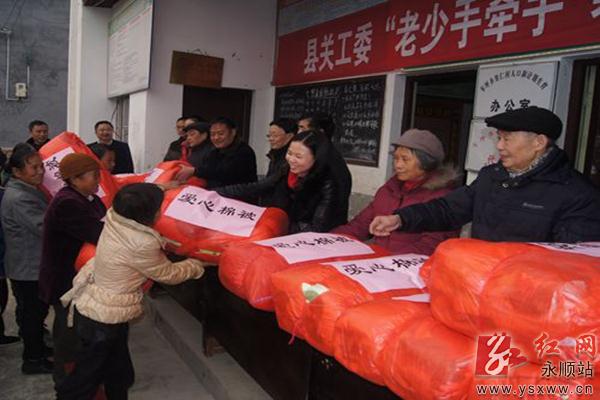 1月5日,永顺县副县长、县关工委名誉主任樊未带领县关工委、民政局关工委相关负责人一行人深入车坪乡里仁村,开展关爱留守儿童、关爱贫困学生,暨“老少手牵手·寒冬关爱行”走访慰问活动。活动中,樊未一行先后共走访慰问了该村20名贫困生和留守儿童,为每名学生送去爱心助学金500元和棉被1床。图为活动现场。通讯员 夏建强 田晓英 摄