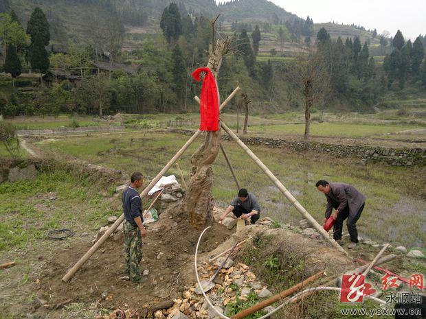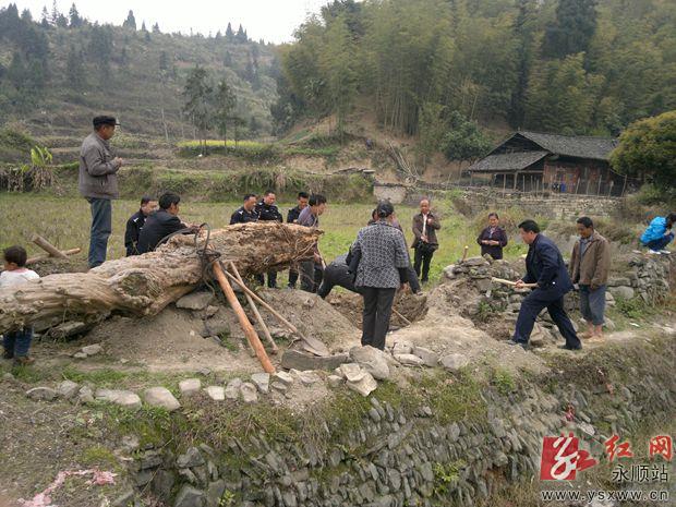 红网永顺站49(通讯员 彭建军)310,永顺县森林公安局泽家派出所民警接到大坝乡盐井村徐家寨村民报警:被称为土家山寨镇寨之宝的福树----紫薇古树被人盗挖了,不知去向。接到报警后,该所民警立即赶往现场,展开现场勘验、调查走访工作,努力搜寻蛛丝马迹。