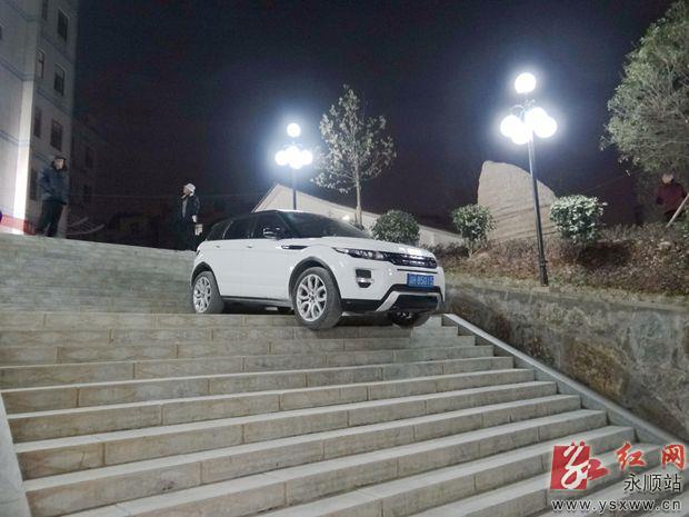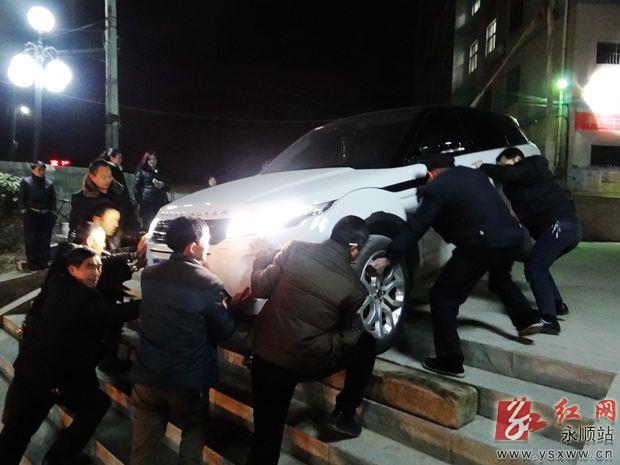 12月26日,一辆白色轿车从永顺县国税局驶出时,刹车不及,冲下门前的台阶,前胎顿时悬空。国税局工作人员和附近的群众主动帮忙解困,抬车上路,让悬空的小车化险为夷。通讯员 唐其柏 摄