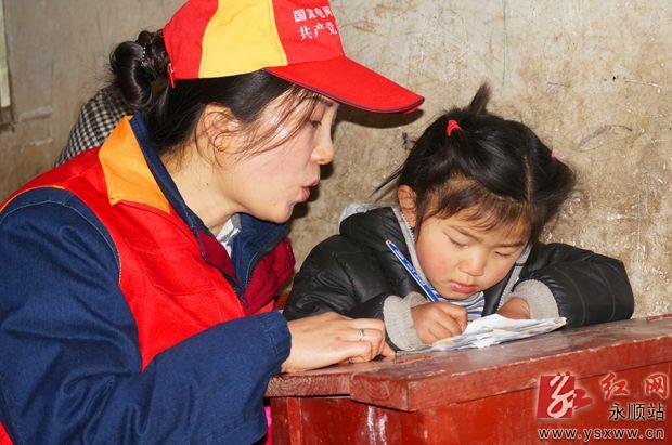3月5日,永顺县电力公司雷锋共产党员服务队志愿者们到吊井乡长光村小,为该校留守儿童送去了书包、作业本、文具盒、羽毛球、牛奶等学习和生活用品。图为该服务队志愿者辅导留守儿童杨熳做作业。通讯员 吴华摄 作者:吴华