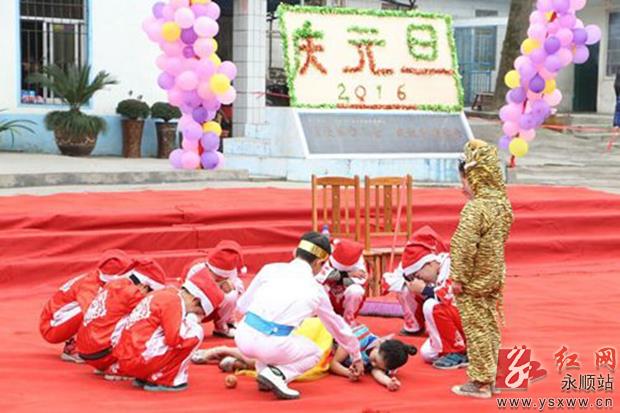,永顺县荣众留守儿童学校邀请全体学生家长与孩子们互动,载歌载舞共同庆祝元旦,辞旧迎新。图为活动现场。