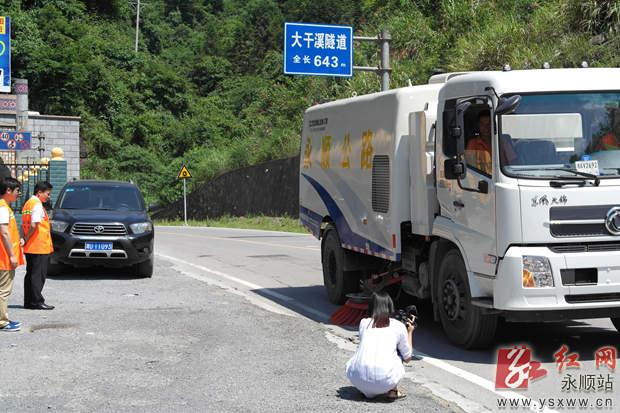 近日,永顺县公路局结合上级强化科技创新的文件精神,采取州公路局补助和自筹资金的方式花费57.8万元购买了一辆道路保洁养护车,用于境内4000多公里公路路面保洁养护作业,开启了机械化养护工作的新征程。图为6月16日,该局新购置的路面清扫车在G209线大干溪隧道路段开展养护作业。通讯员 喻开发 摄