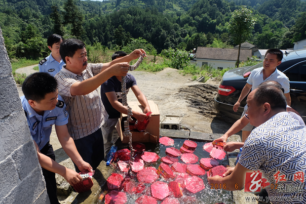 红网永顺站623(通讯员   付治新 詹杰)近日,永顺县安监局在塔卧镇三家田村采用水浸的方式,将执法检查没收的830336发超药量爆竹进行集中销毁。