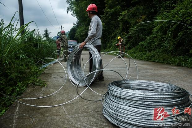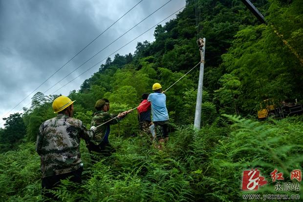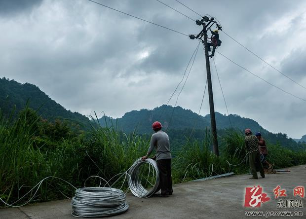 图为永顺县供电公司电力抢险队在万坪镇杉木河段抢修恢复洪灾受损线路。