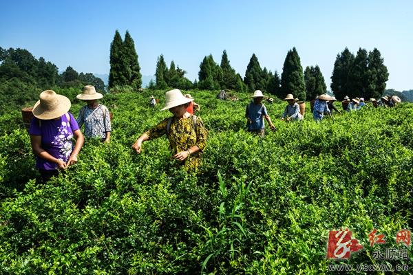 8月25日,永顺县毛坝乡村民在丈岩溪莓茶基地采摘霉茶。近年来,该乡大力发展莓茶产业,种植面积达1800亩。在莓茶专业合作社带领下,采取“规模种植、集中加工、订单销售”的模式,产品畅销广东、淅江等省,并出口韩国、日本等东南亚国家,产值达千万余元,成为当地群众增收的主渠道。记者 余光龙 张灵峰 摄 作者:余光龙 张灵峰