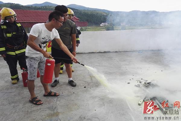 近日,永顺县芙蓉镇保坪小学邀请县消防中队官兵走进校园,进行一系列别开生面的消防实战演练,让师生们在演练中增长消防安全知识,增强安全意识,提高防范能力。图为该校师生在消防官兵的指导下灭火器使用方法。通讯员 张亮 摄 作者:张亮