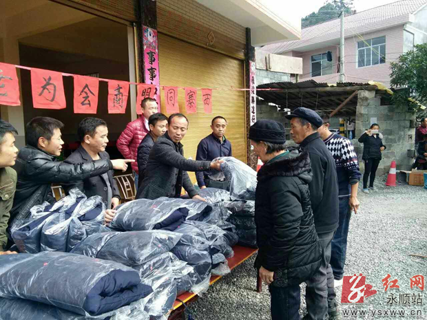 11月22日,永顺县西岐乡西歧村70多位青年外出务工人员自发成立了同盟商会。在成立仪式上,该商会为全村90多名70岁以上的留守老人捐赠了价值10000多元的棉衣,并为贫困户送去救助资金3000元。通讯员 戴业学 摄