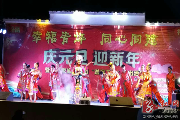 12月30日晚,永顺县青坪镇举办“幸福青坪·同心同建”庆元旦迎新春文艺晚会,县土家族艺术团与当地文艺表演团队载歌载舞,共同欢庆2017年的到来。图为文艺晚会现场。 通讯员 向琴 摄