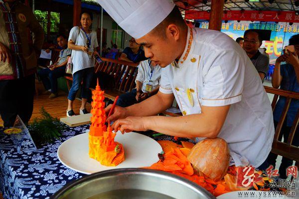 红网永顺站522(记者  彭建国)520,由永顺县人民政府主办,县人社局承办、县就业服务管理中心协办的“武陵味道”特色餐饮、茶文化及特色产品永顺片区预赛活动举行,来自全县特色烹调、食品雕刻、茶艺师三个技能竞赛项目和特色小吃、茶叶两个特色产品评选项目共41人参赛。州县有关部门专家和领导担任评委。