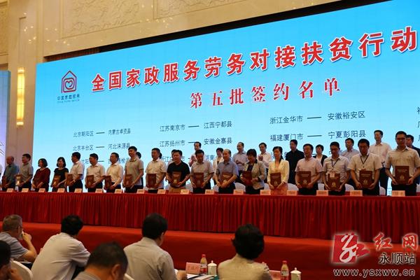 9月15日,永顺县就业服务管理中心主任田宏光在石家庄参加“全国家政服务劳务对接扶贫行动”签约仪式,与浙江省宁波市商务委成功签约,双方在对接中商定了具体目标和行动措施,为该县贫困劳动力转移就业开辟了新的途径。近年来,永顺县人社部门积极开展多渠道的转移就业脱贫工作,进一步加快该县贫困劳动力转移就业脱贫步伐。彭建国 欧阳芳龙 摄
