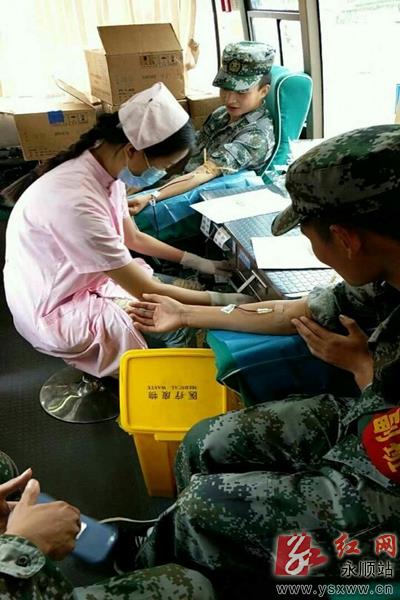 9月28日,永顺县人武部组织143名集训民兵义务献血。 据了解,参加此次义务献血的民兵中有48名是退伍的老兵,他们一致表示,尽管我们已经脱下军装,但我们的心还在部队,这次义务献血,让我们又找到了在部队为国奉献的感觉。通讯员 饶武斌 卢青 摄