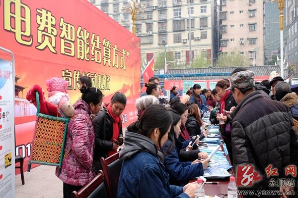 2018年1月1日,永顺县电费将启用智能结算,即先买电后用电,电费日结算月清算,欠费自动断电,网上秒缴费秒到帐的供电智能化商业模式。图为12月23日,永顺县供电公司工作人员在县城湘潭休闲文化广场宣传电费智能结算方式。通讯员 全进芬 摄