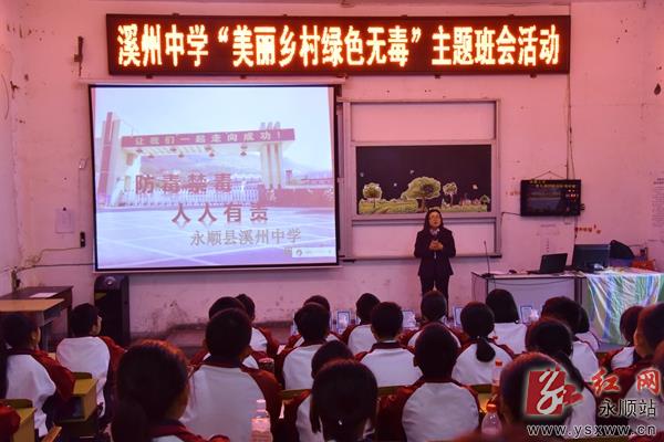 4月18日,永顺县溪州中学以参加全县农村集中禁毒宣传和竞赛总结表彰暨禁毒预防教育现场会为契机,组织学生来到万坪镇开展禁毒教育主题班会。班会以“美丽乡村·绿色无毒”为主题,通过邀请民警现场讲座、观看禁毒教育警示片、禁毒知识问答、禁毒小品表演等方式阐释毒品的危害和“美丽乡村·绿色无毒”创建的意义。永顺分站记者 吴顺忠 摄