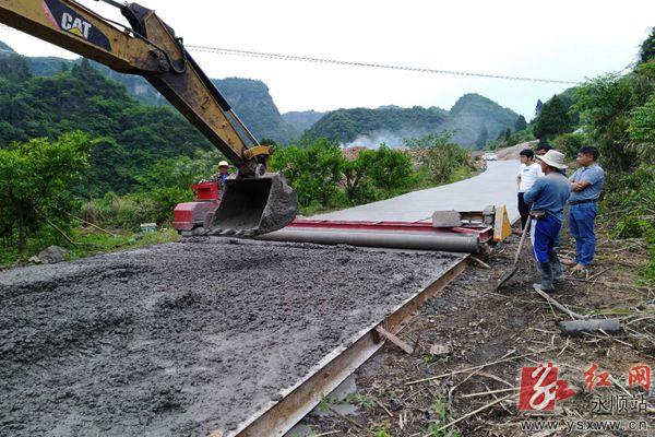 今年来,永顺县交通运输局对全县88个贫困村的道路建设进行整体规划,统一管理,分步实施,全力打通通村公路“最后一公里”。图为5月2日,青坪镇龙关村连接张家界市的村道硬化工程建设现场。 通讯员 王承良 田光明 摄 作者:王承良 田光明