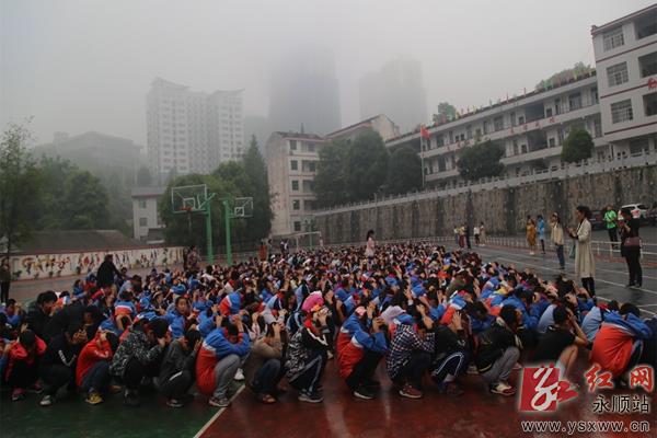 5月12日是国家第十个“防震减灾日”,也是汶川地震十周年纪念日。为表达对“5·12汶川大地震”遇难者的追思,增强师生的忧患意识,提高防灾减灾能力,永顺县教体局组织全县67所学校开展了纪念“5·12”防震减灾演练活动。图为灵溪三小防震减灾演练现场。通讯员 符文斌 洪荣华 摄
