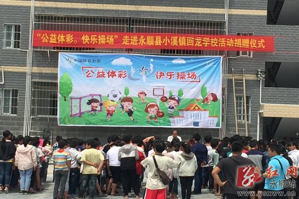 5月29日,2018年“公益体彩•快乐操场”活动走进永顺县回龙九年制学校。“公益体彩•快乐操场”活动由国家体育总局体育彩票管理中心和中华全国体育基金会共同组织开展的公益活动,主要为体育设施匮乏的贫困学校送去需要的体育器材及公益体育课,传播体育彩票“乐善人生”。回龙九年制学校此次获赠了价值3万元的篮球架、乒乓球台、篮球、羽毛球等一批体育器材。这不仅改善学校体育器材缺乏的局面,也可以让学生们感受到来自社会的关爱。 通讯员 洪荣华 向凡 摄