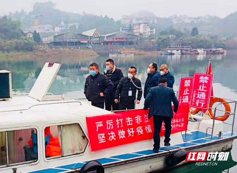 2月2日,在新型冠状病毒感染的肺炎疫情防控关键时期,永顺县芙蓉镇至小溪镇客运专线码头船上,该县水运事务中心工作人员与芙蓉镇、小溪镇政府干部,按照属地管理原则,开展联合办公,打击非法客运,全力做好疫情防控工作,守护一方水上生命线。通讯员 王承良 张贤梅 摄