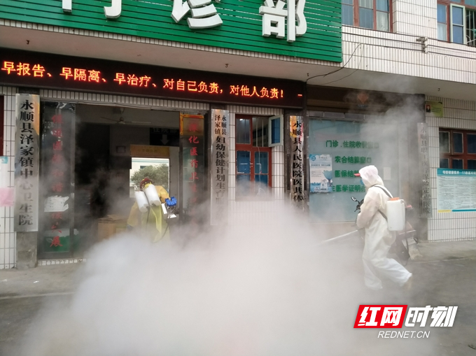 2月21日,永顺县泽家镇联系县社会民间公益救援组织——红十字猛动救援疫情防控工作队,用烟雾机喷洒84消毒液,对集镇街道、农贸市场、卫生院、高速路口、易地扶贫搬迁安置区等公共场所进行义务消毒,面积达4万余平方米。通讯员 向秋霞 摄