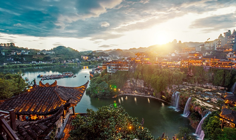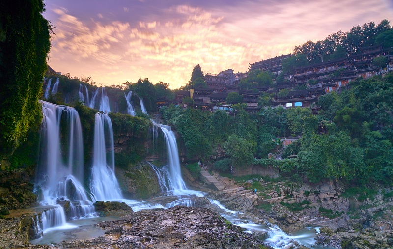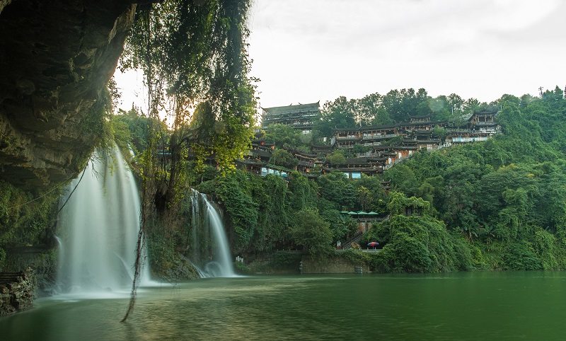 芙蓉镇正临酉水河,左依猛洞河,右傍营盘溪。一个小镇就这么在湘西的腹地接受三条水系亘古的亲吻。正是有了这些水的映衬,芙蓉镇的表情便一下子灵动起来,丰富起来,美丽起来。