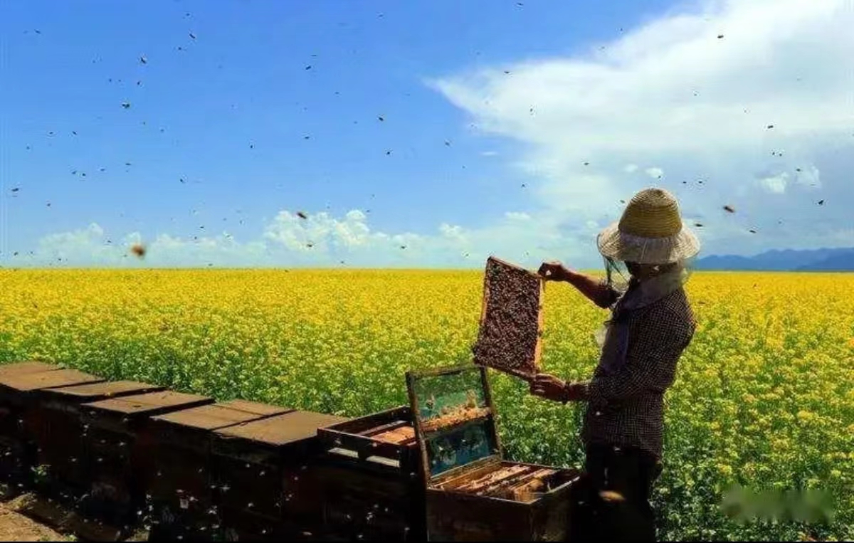 放蜂人擎着他的蜂阵在四月的额头,飘摇一面猎猎的旌旗,蛰伏入土的根系,于旗语的昭示里苏醒,忙将酝酿了一冬的红的酒黄的酒蓝的酒紫的酒,盛满阳光金色的酒尊,将四月的大地,灌得酩酊大醉。酩酊大醉的四月,缱舒惬意地躺在放蜂人脚边,以流水的淙淙和蒿草的青青,热情地邀他同饮。放蜂人不胜酒力,在金黄中摇起白旗,而他的蜂们却尽是酒鬼,在四月惊诧的瞳仁里,钻进红色黄色蓝色紫色酒尊里开怀痛饮,还提着纤小精致的酒杯,将四月春光酿进蜜里。