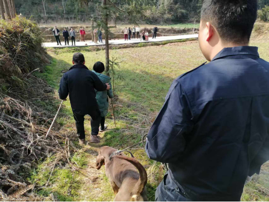 为尽快找到走失田某,搜救组立即报请湘西州公安局刑侦支队警犬大队参与搜救支援。2月19日14时许,警犬大队训导员携搜救犬“艾琳”抵达现场,在成功提取田某专属嗅源后,“艾琳”立即投入追踪作业。凭借灵敏的嗅觉和专业的搜救能力,警犬一路精准追踪,最终在距离田某住所2公里处的竹林内,成功找到走失的田某。经现场检查,田某身体状况一切正常,暂无任何不适。