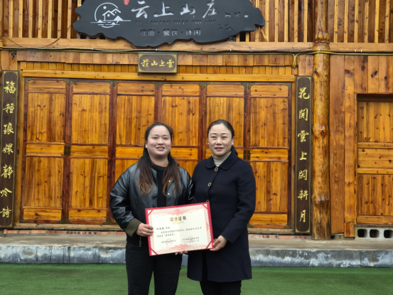 座谈结束后,向春燕领着大家走进了她的创业“战场”。空气中弥漫着酸菜发酵的醇厚与腊肉熏制的烟火气。腊肉加工车间里,柏枝熏香弥漫,传承着湘西古法腌制工艺,将谷物喂养的土猪肉变成舌尖上的乡愁。登上云上山庄观景台,远山如黛,梯田层叠,山风拂面而来。向春燕在一旁介绍着经营情况,言语间,透着一位创业者的自信与从容。州妇联主席张明不时询问起企业带动妇女就业情况,发展中遇到困难,并针对性地提出了建议。临别时,她握着向春燕的手说:“妇联就是你的娘家,有事随时找我们。”
