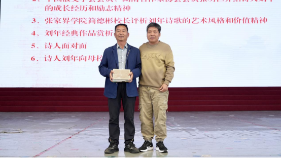 分享会上,表演者深情朗诵了《悲歌》《永顺城》《骑摩托一起去大西北》等经典作品,多位师生登台解读。在“诗人面对面”环节,同学们踊跃提问,刘年耐心解答并赠送亲笔签名诗集。活动最后,刘年向母校捐赠了全套作品,以书香寄寓传承,助力校园文化建设。