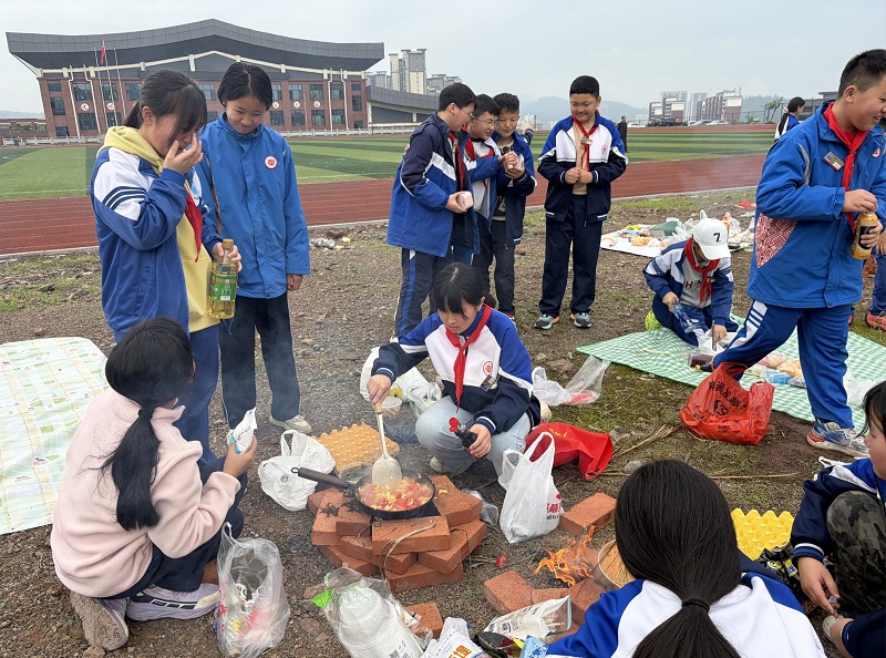 第一次独立做饭,学生们个个有模有样。F2007班的彭英豪炒出一盘颜色发黑的土豆丝,自己尝了一口后对组员说:“虽然不好看,但不许跟我抢。”不到两分钟,这盘菜成了当天第一道“光盘”的菜品。六年级F2004的张梦婷做的可乐鸡翅得到了全班同学的好评。校长也来到各组灶台前,尝了学生炒的菜后笑着说:“个个都是小厨师,做的饭菜真美味。”用餐结束后,各班学生主动清理灶台、打扫场地、分类垃圾,整个过程有条不紊。