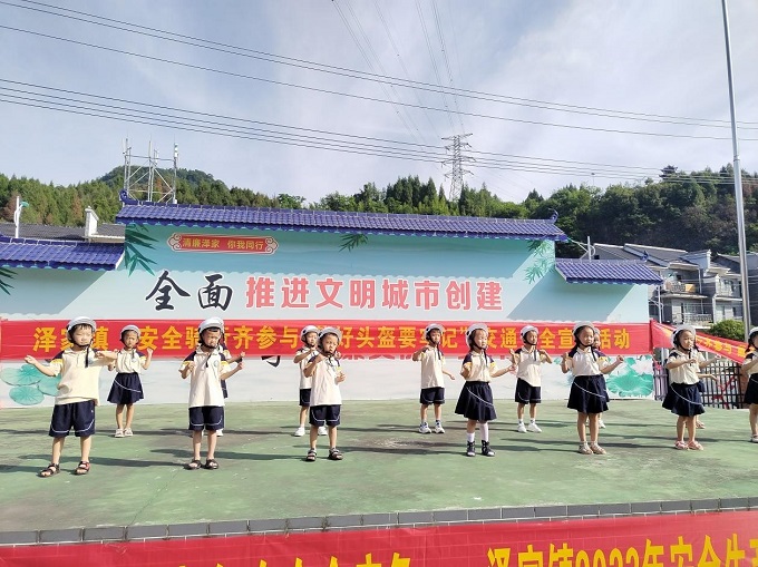 在交警与执法队员的护航下,幼儿园小朋友们戴着太平洋保险公司与大地保险公司赠送的特制“小”安全头盔穿行过集镇,用稚嫩而响亮的声音喊出“一盔一带,安全常在”等宣传口号,并在舞台上表演以“佩戴安全头盔”为主题的节目,引得集镇居民纷纷驻足观看,表示要向小朋友学习,骑车不忘戴头盔。