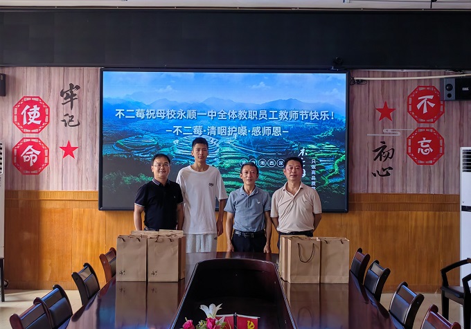 9月9日,永顺不二莓茶厂长向成顺一行来到永顺一中,为永顺一中306位教职工每人送上一份价值140元的莓茶礼包,致以节日的问候。据了解,不二莓茶园和不二优品制茶厂位于莓茶核心产区、永顺县猛洞河上游首车花果山,是由永顺一中2002届185班校友吴吉文等人打造的高端莓茶品牌,市场供不应求。今年教师节,不二莓团队特意来到永顺一中,向母校教师送上节日祝福,以实际行动营造尊师重教的良好氛围。通讯员 周玉萍 摄
