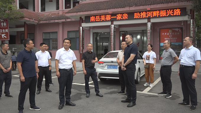 图为衡阳市南岳区调研组一行到芙蓉镇河畔社区调研