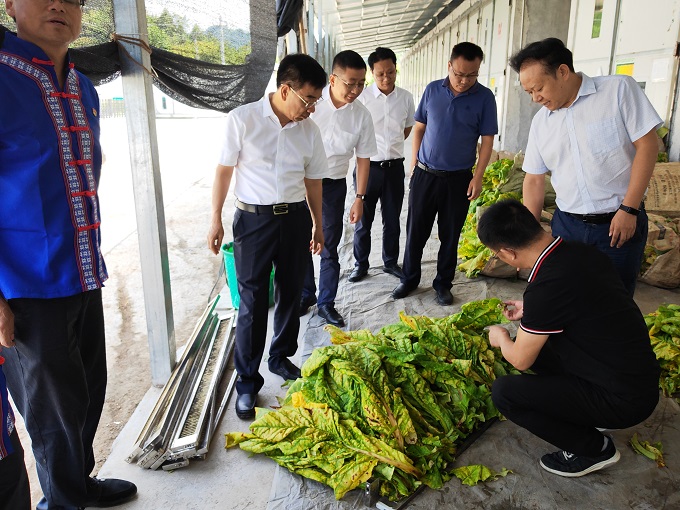 图为湖南省烟草局党组书记、局长、总经理孔祥统一行查看那丘村烟叶收成和烘烤情况