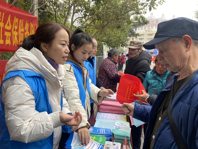 图为县医保局工作人员为市民宣传《社会保险条例》