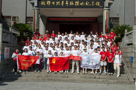 图为研学人员在湘鄂川黔革命根据地纪念馆前合影