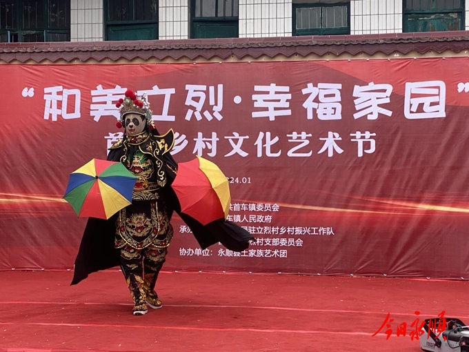 艺术展演精彩纷呈,来自县土家艺术团、长沙理工大学乡村振兴志愿者、中建五局乡村振兴工作队、立烈村乡贤和村民等纷纷登台献艺,舞蹈、川剧变脸、土家打溜子、二胡独奏、诗朗诵、红色情景剧等精彩节目轮番上演,为村民献上了一场难得的视听盛宴。