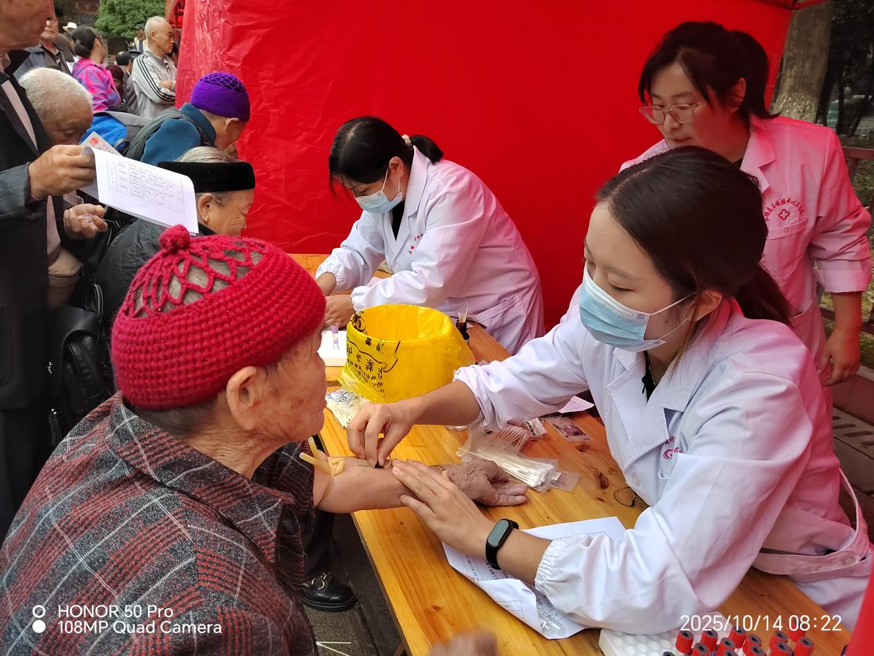 广场上,30名来自全县45个乡镇卫生院、县人民医院的医务人员各司其职:抽血、做心电图、查B超、测血压……全流程服务有条不紊。这边,医护人员耐心询问老人病史,细致填写体检表;那边,专人忙着发放体检报告,还贴心准备了免费早餐及爱心礼物。现场维护秩序的工作人员不时搀扶行动不便的老人,一句“慢点走,我扶您”,让秋日的广场格外温暖。