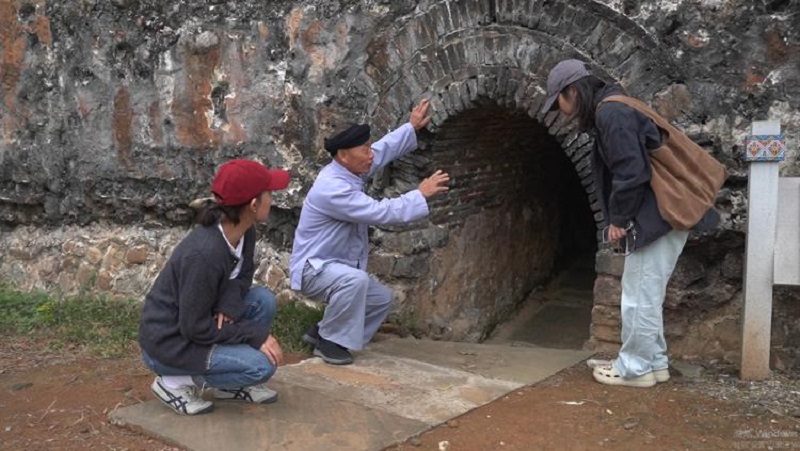 图为“老司城传说”省级非物质文化遗产代表性传承人向世芹在向游客介绍老司城排水系统