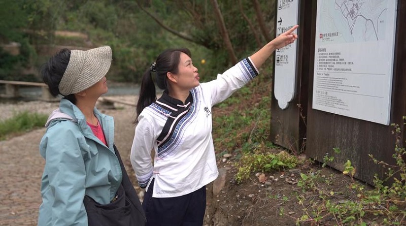 图为老司城村民鲁红霞在向游客讲解老司城遗址