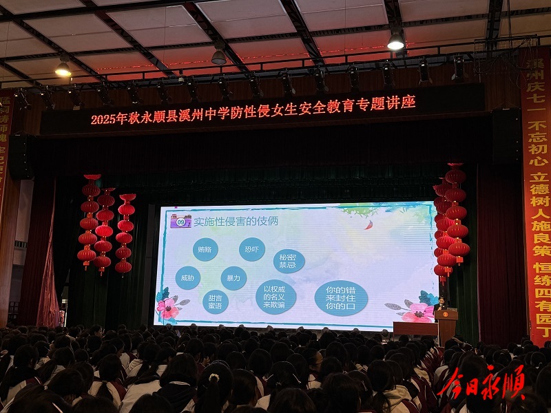 永顺融媒10月23日讯(通讯员 田峰 田秋霞)为筑牢初中女生自我保护防线,增强法治观念,近日,永顺县人民检察院携手溪州中学,为该校1000多名初中女生精心打造了一堂“花季守护课”,以法治力量护航青春成长。