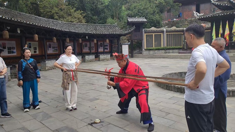 在“土家第一村” 双凤村,今年新落成的景区吸引了大量游客前来探寻土家文化。村民与游客对唱山歌,欢快地跳摆手舞,游客们还能现场观赏并体验“土王招婿”“仙人合竹”等非遗项目,沉浸式体验土家文化的厚重与神秘。