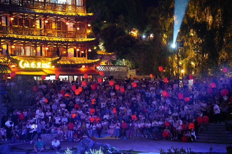 夜幕降临后,芙蓉镇的“夜经济”与文化体验同步升级。“万家灯火”点亮后,吊脚楼与酉水河畔的灯光交相辉映,构成一幅流光溢彩的夜景,吸引众多游客驻足拍照。摆手堂内,《欢迎来到芙蓉镇》音乐短剧将土家传说与现代幽默相融合,赢得观众阵阵掌声。