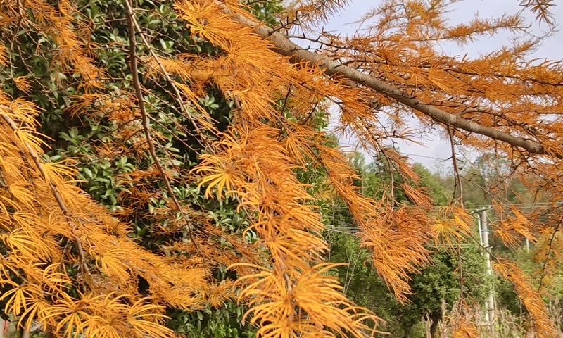 走入山林,一株株挺拔的金钱松如卫士般矗立。历经秋霜,其原本翠绿的条形叶片已悄然换上金黄的“盛装”。阳光之下,成片的金钱松林仿佛金色的海洋。微风拂过,叶片轻响,平添几分诗意。其叶片螺旋状排列,形似一枚枚小巧的古铜钱挂满枝头,不仅构成了视觉上的盛宴,其“招财进宝”的美好寓意也为渐寒的冬日增添了吉祥温暖的韵味。