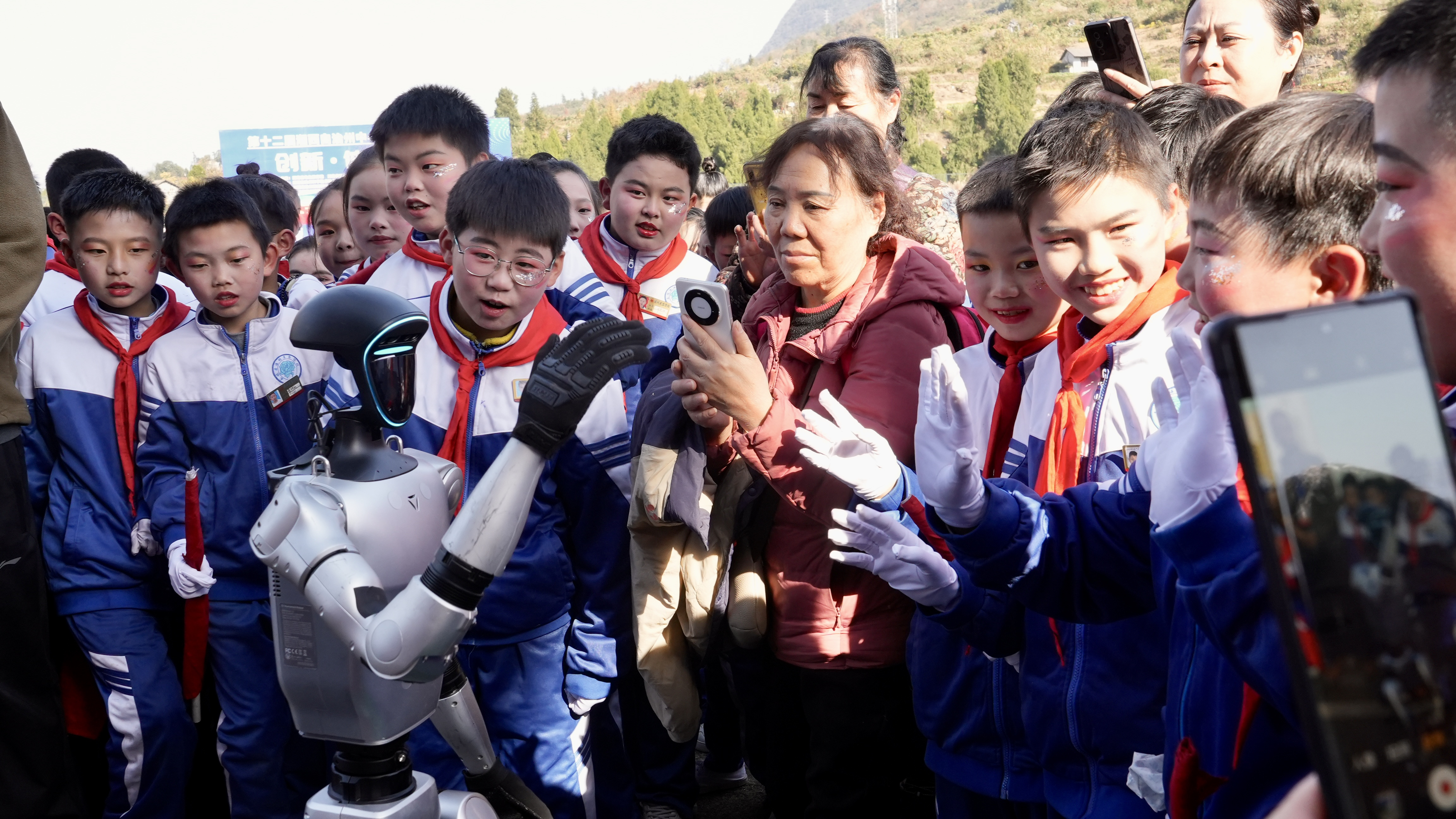 图为学生在与机器人互动