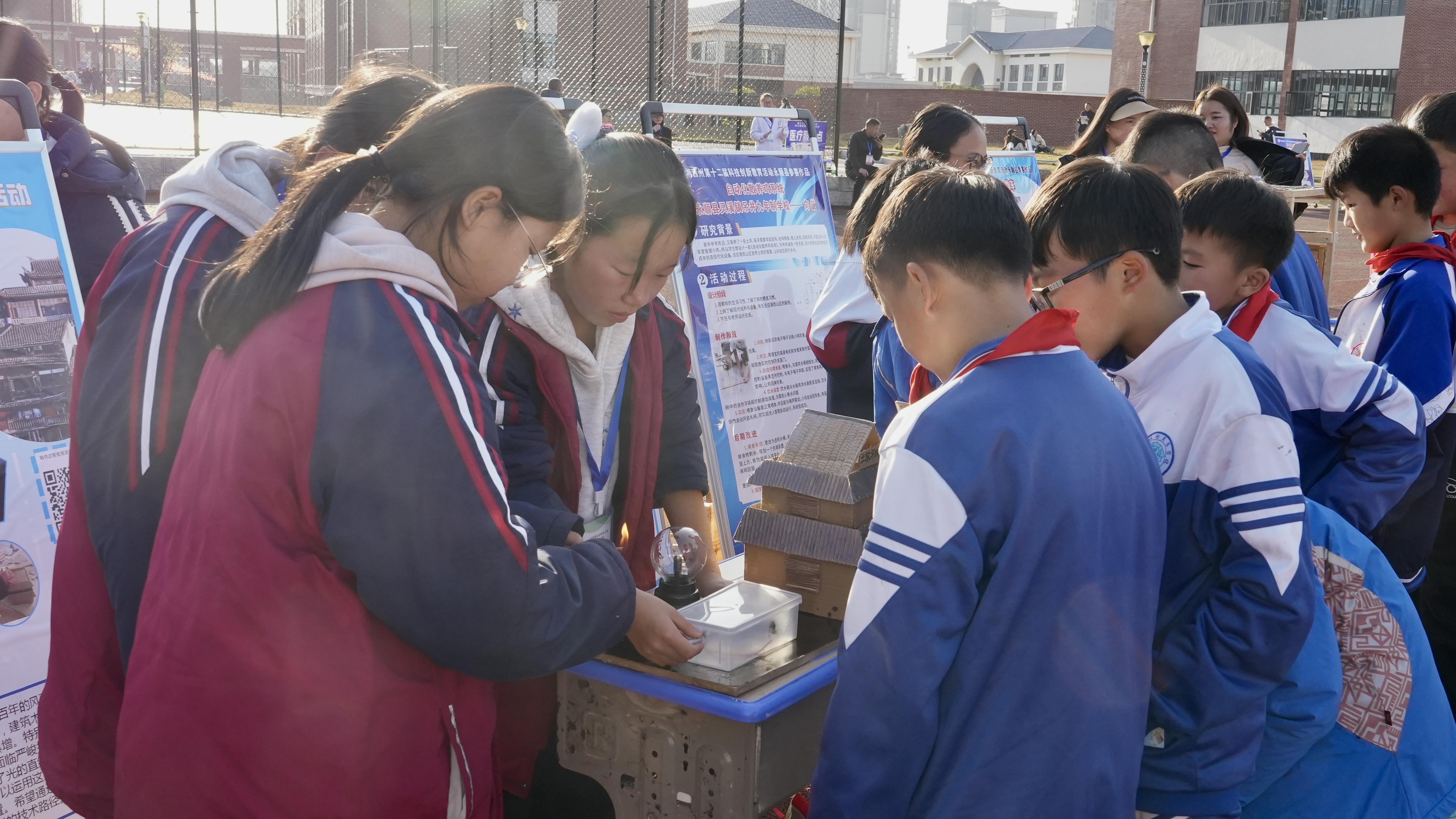 图为永顺县参赛学生在解说自己的科技作品
