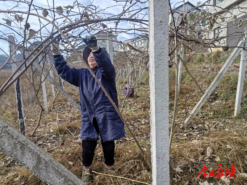11月21日,在松柏镇龙桥社区一猕猴桃基地,果农们正穿梭于田间,为猕猴桃树进行冬季整枝。连日来天气晴好,松柏镇三万余亩猕猴桃树在经过几场雨后已褪去绿装,正是冬季管护的关键时节。果农们纷纷手持枝剪,娴熟修剪,为来年的丰收打下坚实基础。通讯员 罗远程 雷夏铭 摄