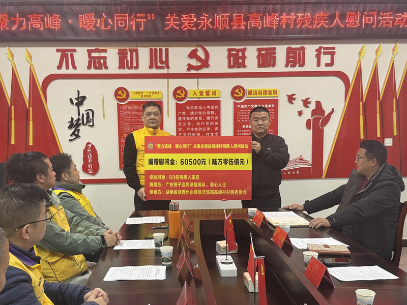 寒意渐浓,冬韵愈深。11月23日,在湖南省文化和旅游厅驻高峰村乡村振兴工作队积极对接联系下,广东狮子会同济服务队跨越千里从广东奔赴永顺县灵溪镇高峰村,开展“聚力高峰·暖心同行”残疾人帮扶慰问活动,为全村60名残疾乡亲送去60500元慰问金及3000元物资,以实际行动传递社会关爱,为乡村振兴注入温暖力量。