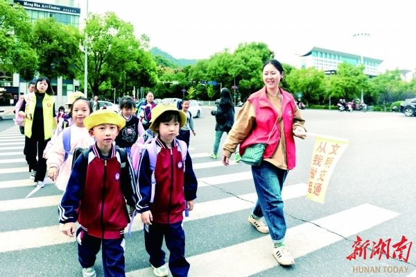 文明交通劝导志愿者引导行人文明出行。向涛摄