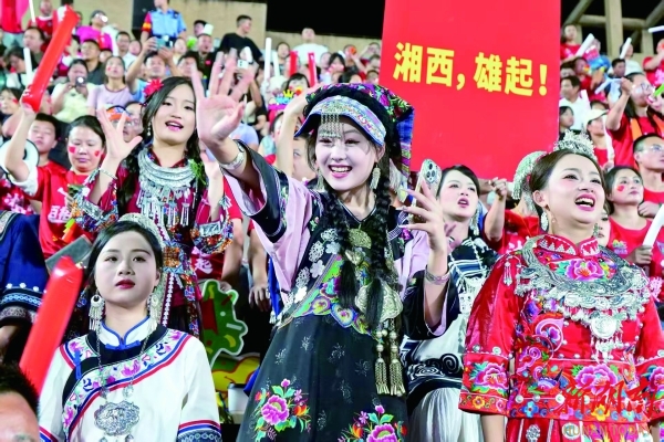 10月11日晚,凤凰县巾帼文旅志愿者在“湘超”赛场为足球健儿加油助力。吴东林摄
